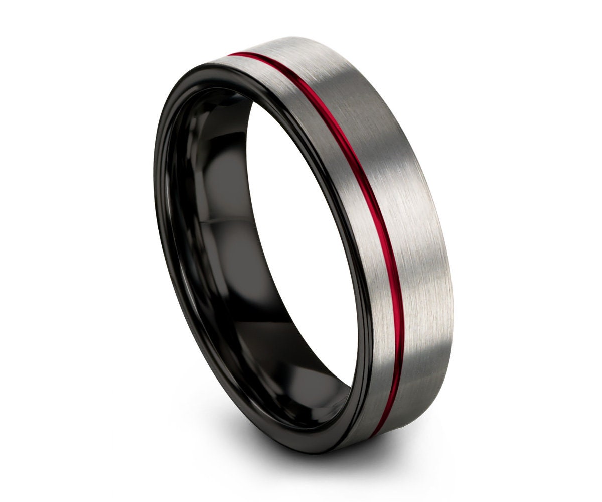 Tungsten Ring Mens Brushed Silver Black Red Wedding Band