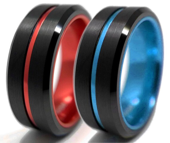 Tungsten Ring Matching Set Red Blue Thin Line Black Ring Etsy