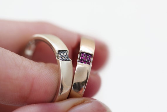 His And Hers Matching Wedding Diamond Princess Cut Bands With Ruby