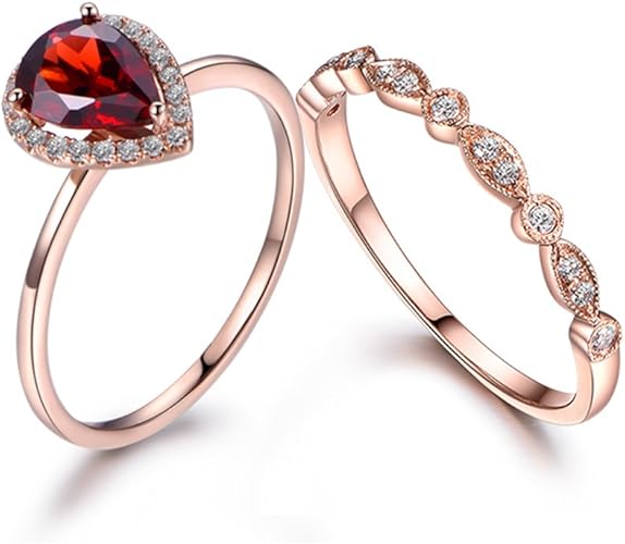 2pcs Bridal Ring Set 6x8mm Pear Cut Garnet Engagement Ring 14k
