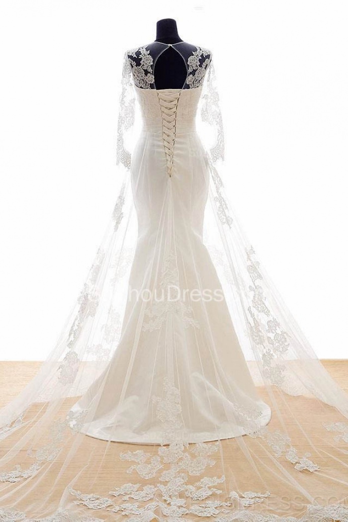 White Lace Long Sleeve Mermaid Bridal Gowns Sweep Train Lace Up