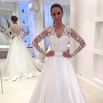 V Neckline Satin Wedding Gowns Bride With Sheer Lace Sleeves
