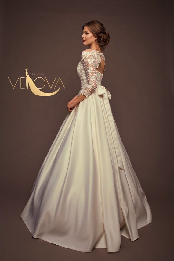 Ivory Lace Satin Wedding Dress Ball Gown A Line Long Sleeve Bela
