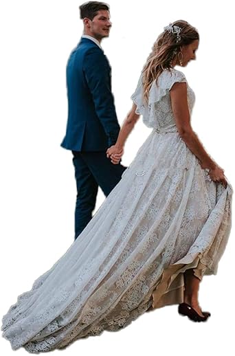 Fashionbride Women S Bohemian Wedding Dresses Short Sleeve V Neck