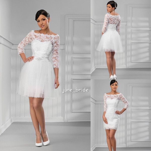 2020 White Short Mini A Line Fitted Wedding Dresses 3 4 Sleeves
