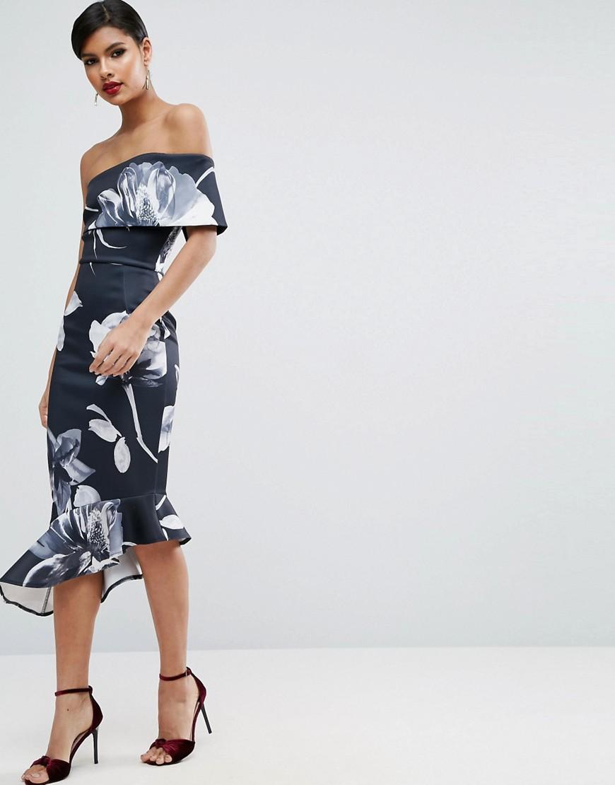 Asos Wedding Printed Bardot Off The Shoulder Hitchcock Midi Pencil